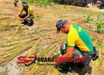 Lembor, 11 November 2025, anggota Koramil 1630-02/Lembor, Serda Komang Sugito, melaksanakan kegiatan pendampingan kepada masyarakat petani dalam kegiatan panen padi yang berlokasi di persawahan Ramina...