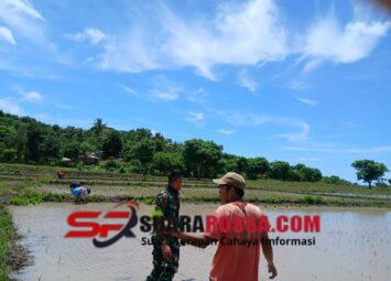 NTT – Sumba Timur. Babinsa Koramil 04/Tabundung jajaran Kodim 1601/Sumba Timur, Pratu Denis Deru Peta, melaksanakan pendampingan ketahanan pangan (Hanpangan) dengan turun langsung ke sawah memba...