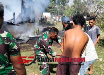 SATGASTER KODIM 1605/BELU, Anggota Satgaster Kodim 1605/Belu Pos Metamauk Serma Muslimin dan Sertu Yudha M Nur dengan sigap bergerak cepat ikut membantu memadamkan api yang membakar rumah warga milik ...
