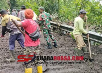 Bangli – Personel Koramil 1626-04/Kintamani bersama unsur TNI–Polri dan masyarakat melaksanakan kegiatan Karya Bakti pasca terjadinya tanah longsor yang menutup akses jalan penghubung Banja...
