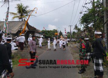 Tabanan – Babinsa Desa Beringkit Belayu Koramil 1619-06/Marga, Serda I Wayan Sardika, melaksanakan atensi dan pengamanan kegiatan Upacara Piodalan di Pura Dalem Batan Waru Banjar Adat Bajera Bel...