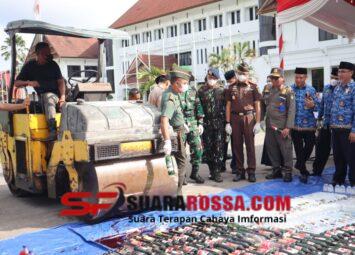 Sumbawa, NTB – Kepala Staf Kodim (Kasdim) 1607/Sumbawa, Mayor Inf Dahlan, S.Sos., menghadiri kegiatan pemusnahan barang bukti minuman beralkohol hasil patroli rutin dan operasi gabungan dengan mekan...