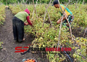 Satgas Pamtas RI–RDTL Sektor Timur Yonarmed 12 Kostrad melalui Pos Laktutus melaksanakan kegiatan panen tomat bersama masyarakat desa binaan di Desa Fohoeka, Kecamatan Nanaet Dubesi, Kabupaten Belu,...