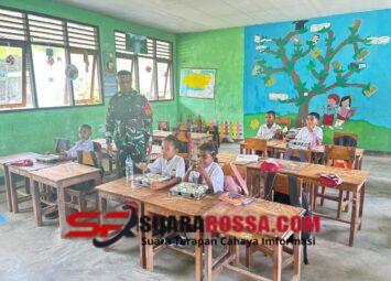 Babinsa Desa Nailang dan Desa Waisika, Praka Bing Jonas Lau We, melaksanakan kegiatan pemberian makan sehat dan bergizi bagi anak sekolah di wilayah Kecamatan Alor Timur Laut, Kabupaten Alor, pada Rab...