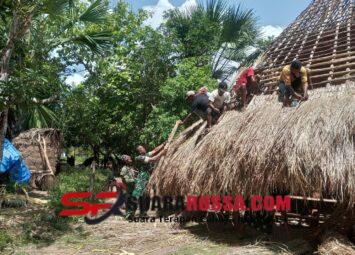 KODIM 1605/BELU, Anggota Satgaster Kodim 1605/Belu Pos Halibete II Serda Hironimus Kono bersama warga bahu membahu membantu dalam proses pengerjaan pengatapan rumah adat Suku Uma Alin di Dusun Lahurus...