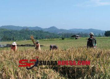 KODIM 1605/BELU, Babinsa Desa Tohe Koramil 1605-08/Haekesak Sertu Dominggus Pareira membantu petani memotong padi pada MT 2 di Dusun Kotafoun B, Desa Tohe, Kecamatan Raihat, Kabupaten Belu NTT, Kamis ...